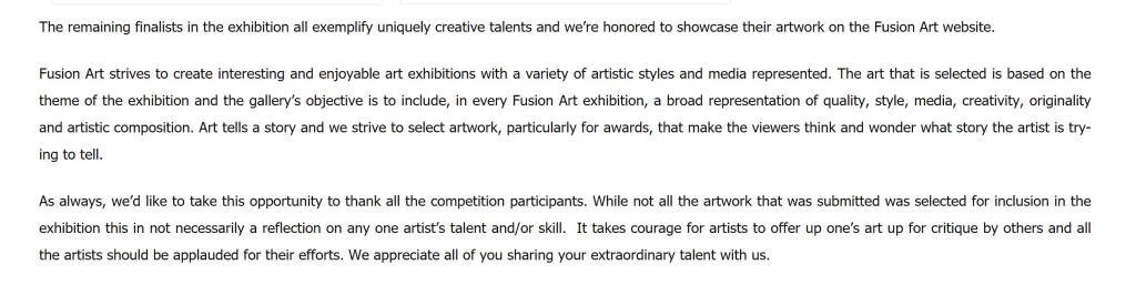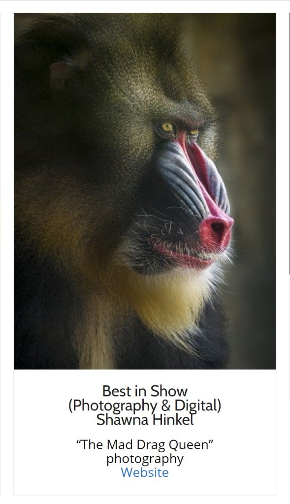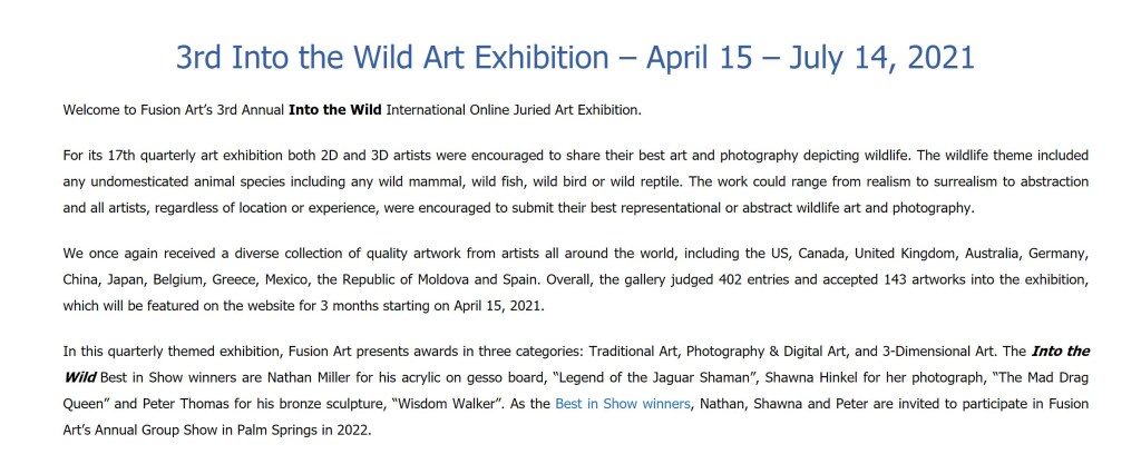 “The Mad Drag Queen” received BEST IN SHOW in Fusion Art’s “Into the Wild” Exhibition! “Feeling Blue” and “Want to be My Friend?” (mistitled on the website) were also finalists. 😀 Artists in 12 countries submitted their artworks of various mediums, and 143 pieces were selected for the show.