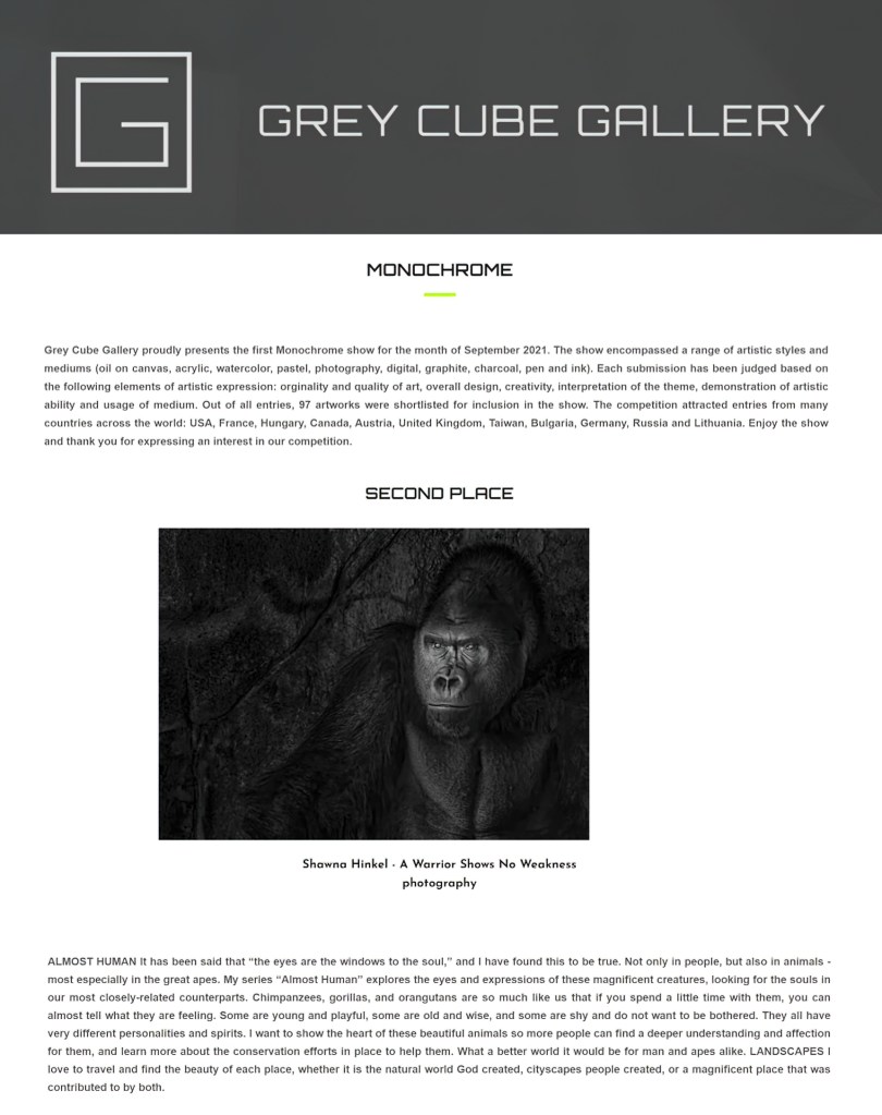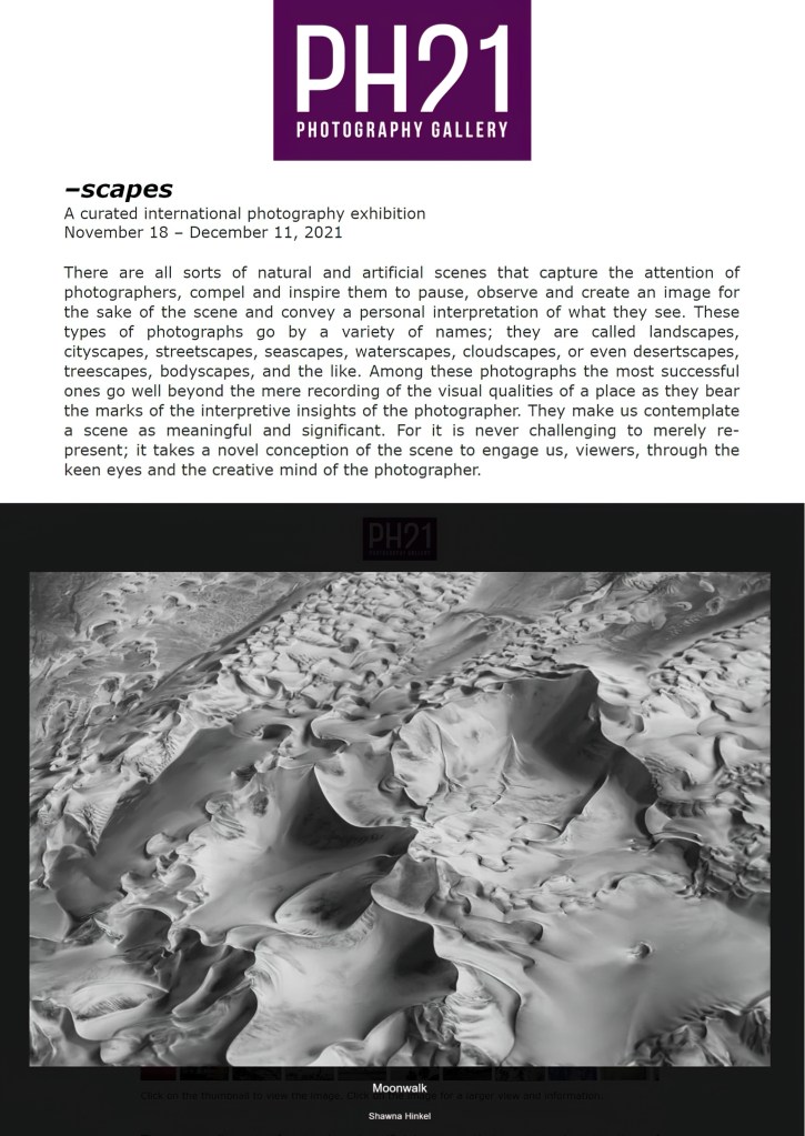 I am honored that my images received awards in three categories of the 2021 International Photography Awards! “Morning Solitude” received Honorable Mention in the Special, Panorama Category and the Nature, Landscape Category. The “Almost Human” series received Honorable Mention in the Deeper Perspective Category. 😀
