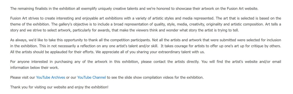 “Daddy’s Sidekick” took 3rd Place in Fusion Art’s “Animal Kingdom” Exhibition! “Protected” and “Want to be My Friend?” were also finalists. 😊 Artists in 15 countries submitted their artworks of various mediums, and 138 pieces were selected for the show.