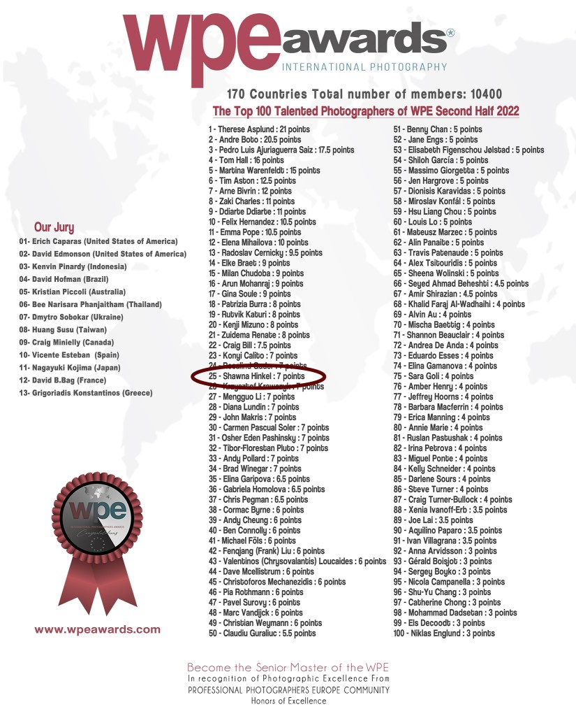 The results are in from WPE Awards Europe! I received 7 Silver Awards in the 2022 Second Half competition and finished in the Top 100 Photographers! 😲