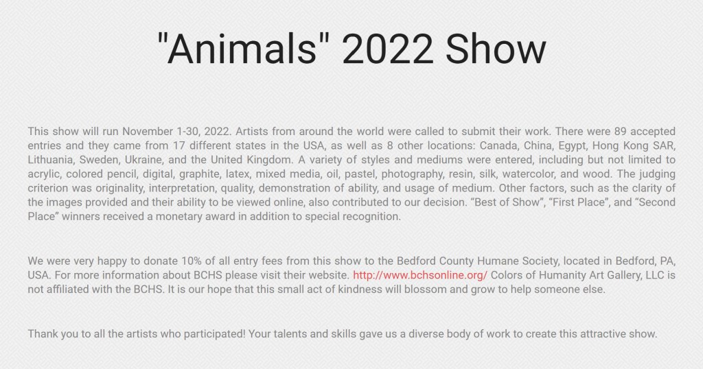 Colors of Humanity Art Gallery selected four of my images for the “Animals” Exhibition! 😊 Artists in 9 countries submitted their artworks of various mediums, and 89 pieces were selected for the show.