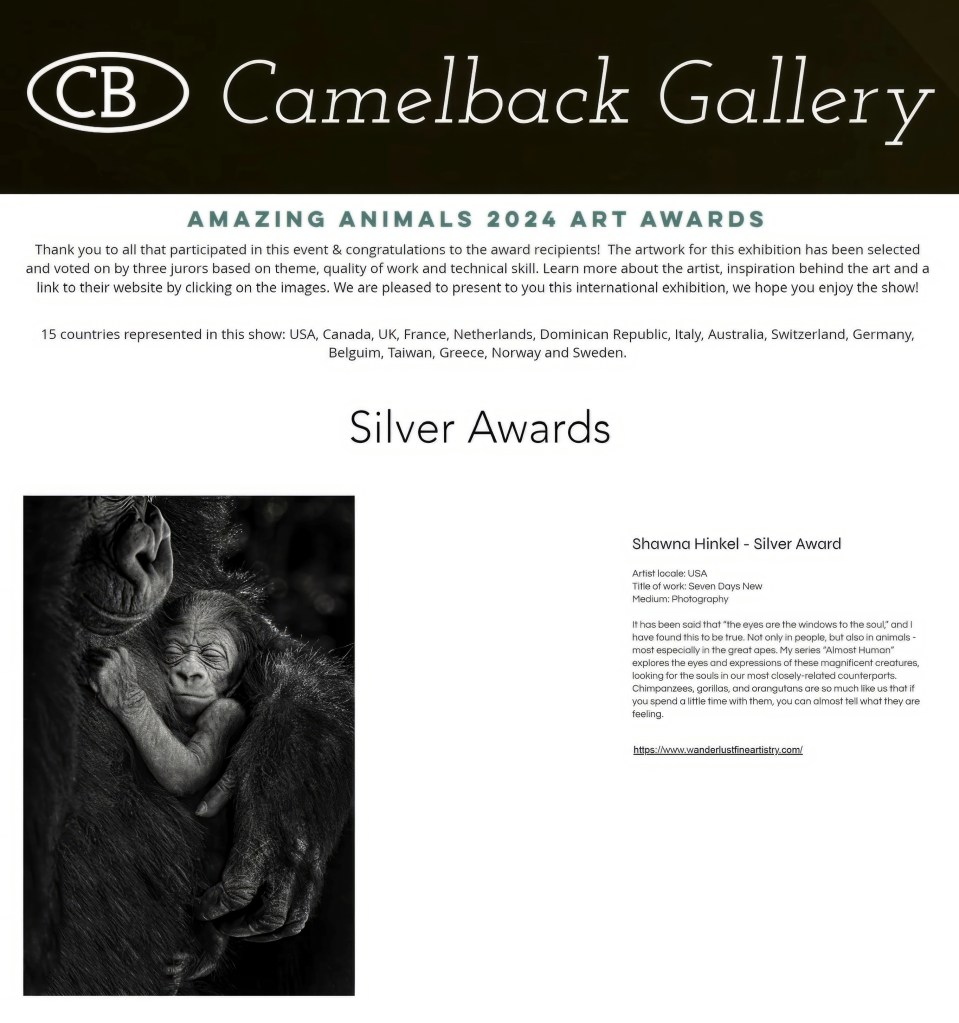 “Seven Days New” received a Silver Award in Camelback Gallery’s “Amazing Animals” Exhibition! “Cover Girl” was also a Finalist!😊 Artists in 15 countries submitted their artworks of various mediums, and 111 pieces were selected for the show.
