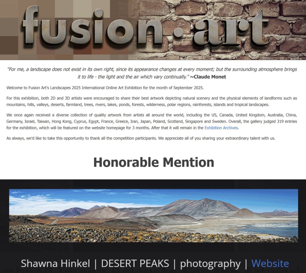 “Desert Peaks” received Honorable Mention in Fusion Art’s “Landscapes” Exhibition! “From Night to Day” was also a finalist. 😀 Artists in 19 countries submitted their artworks of various mediums, and 94 pieces were selected for the show.